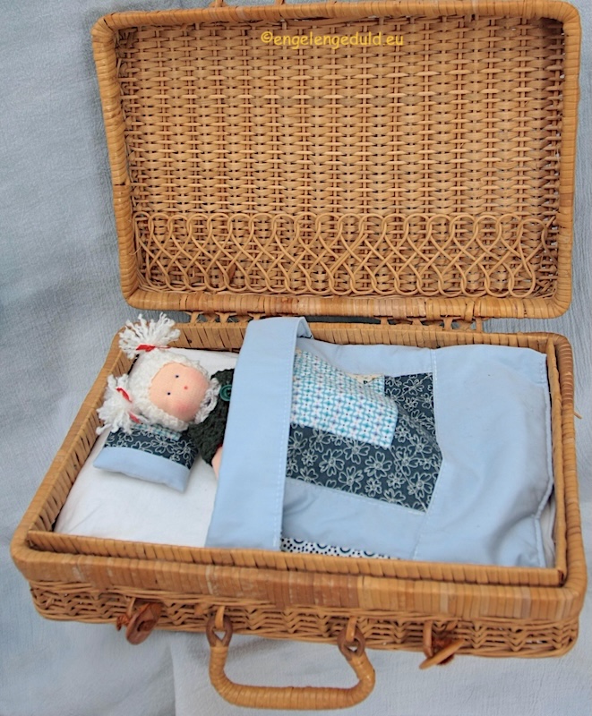 Het rieten mandje is omgetoverd tot een bedje, met matras, patchwork kussen en dekentje.